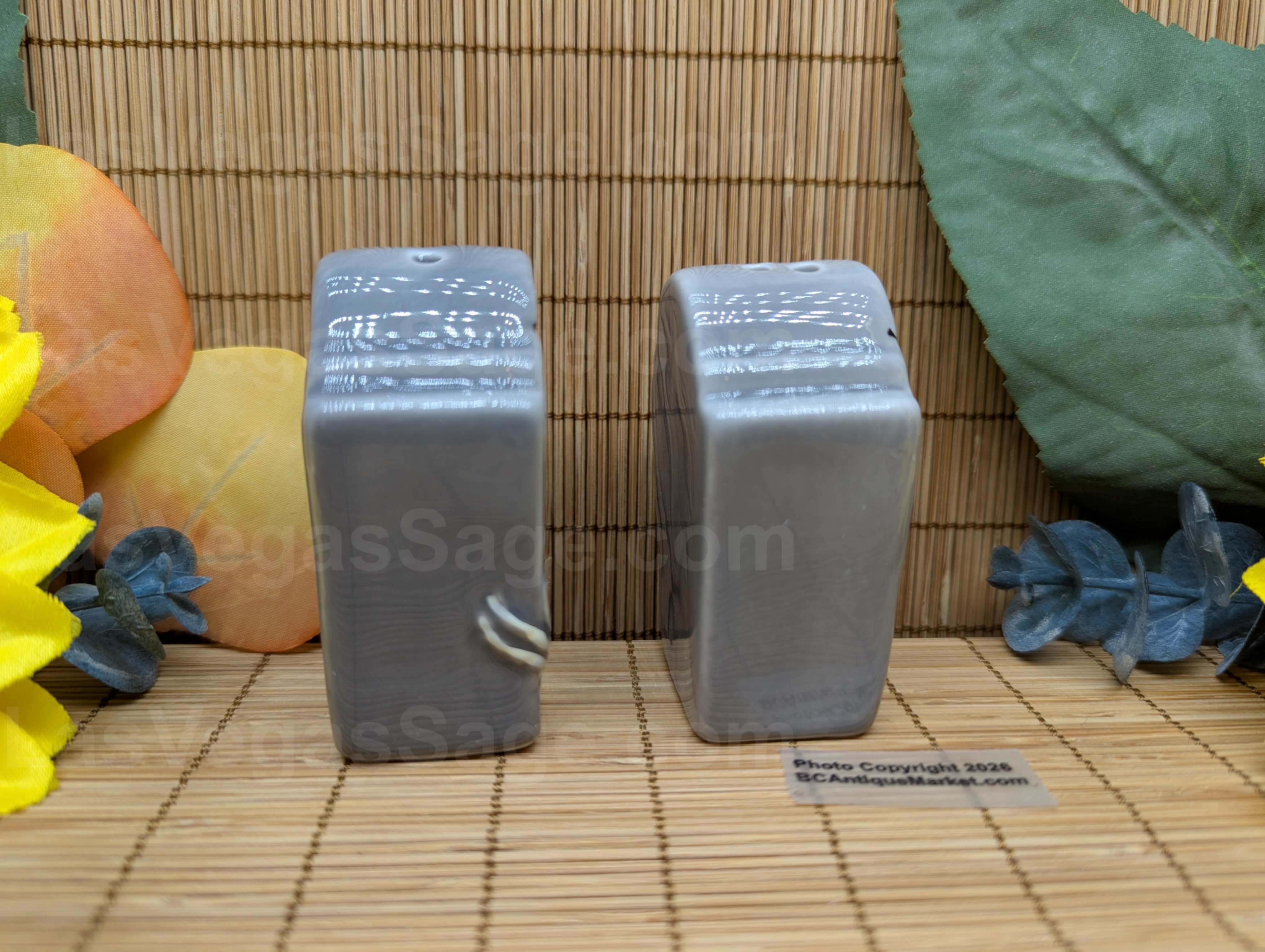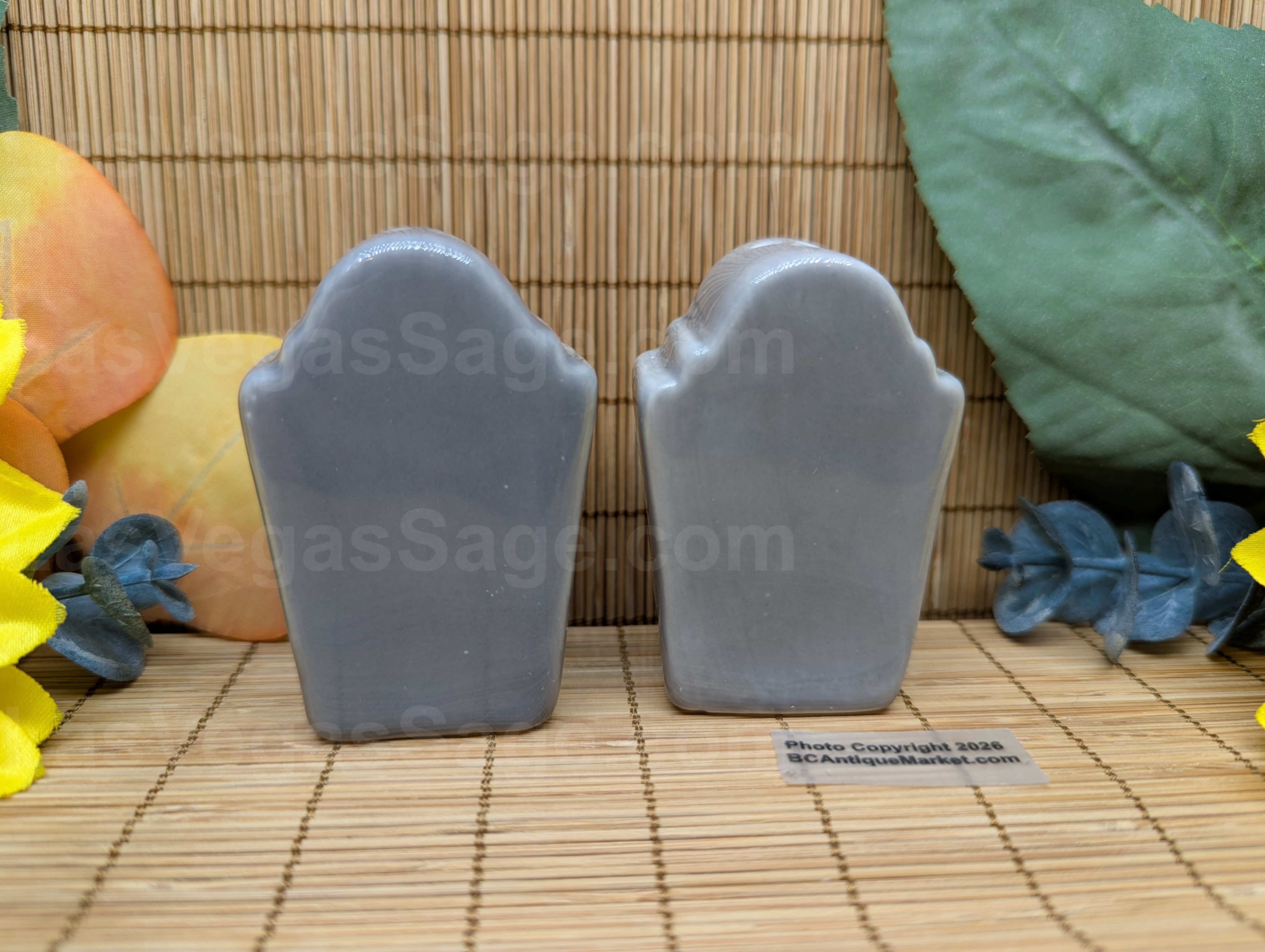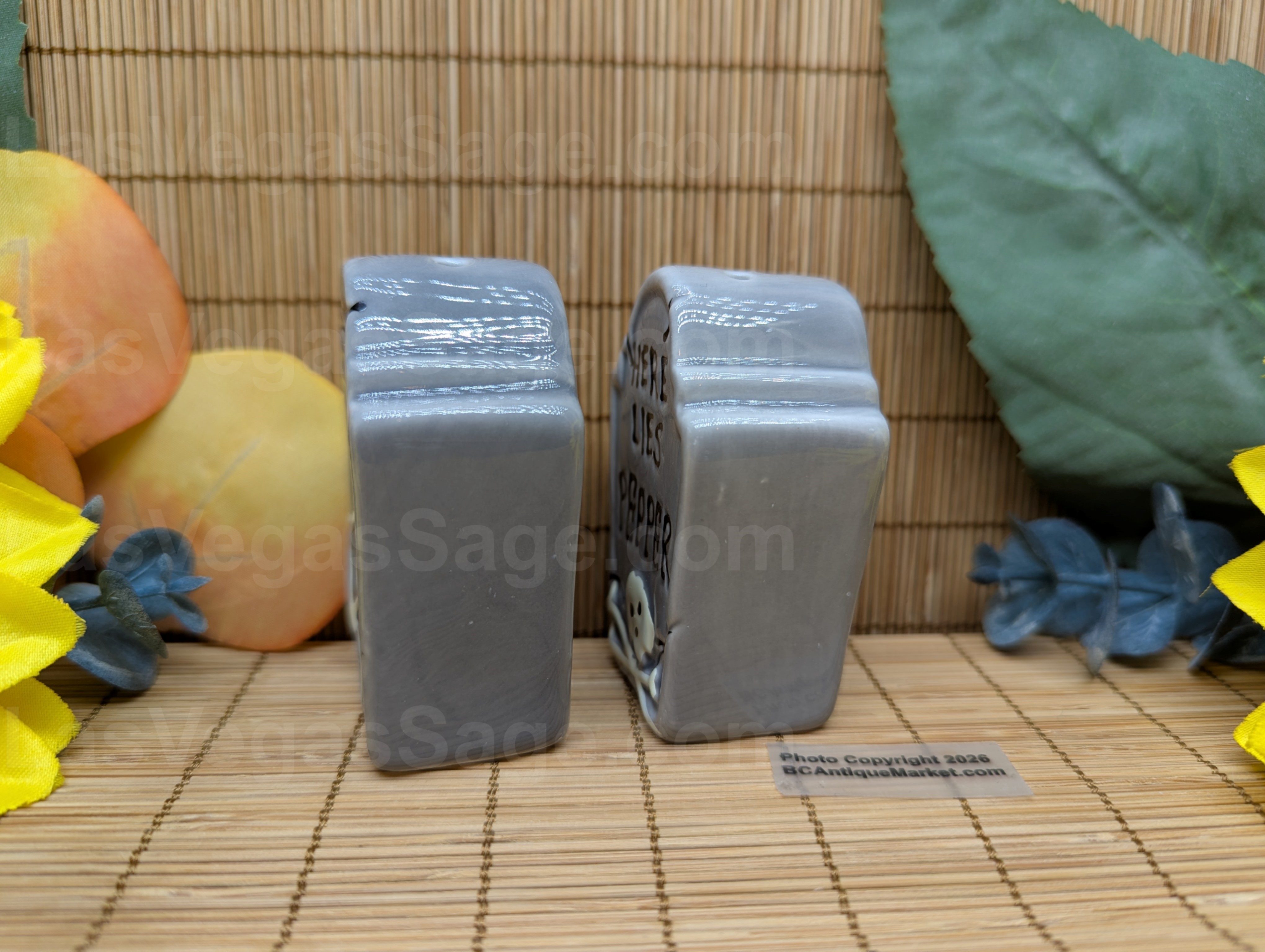 Super cute, detailed salt and pepper gravestones! Grey with black and white details, each aprox 2.5 inches high.