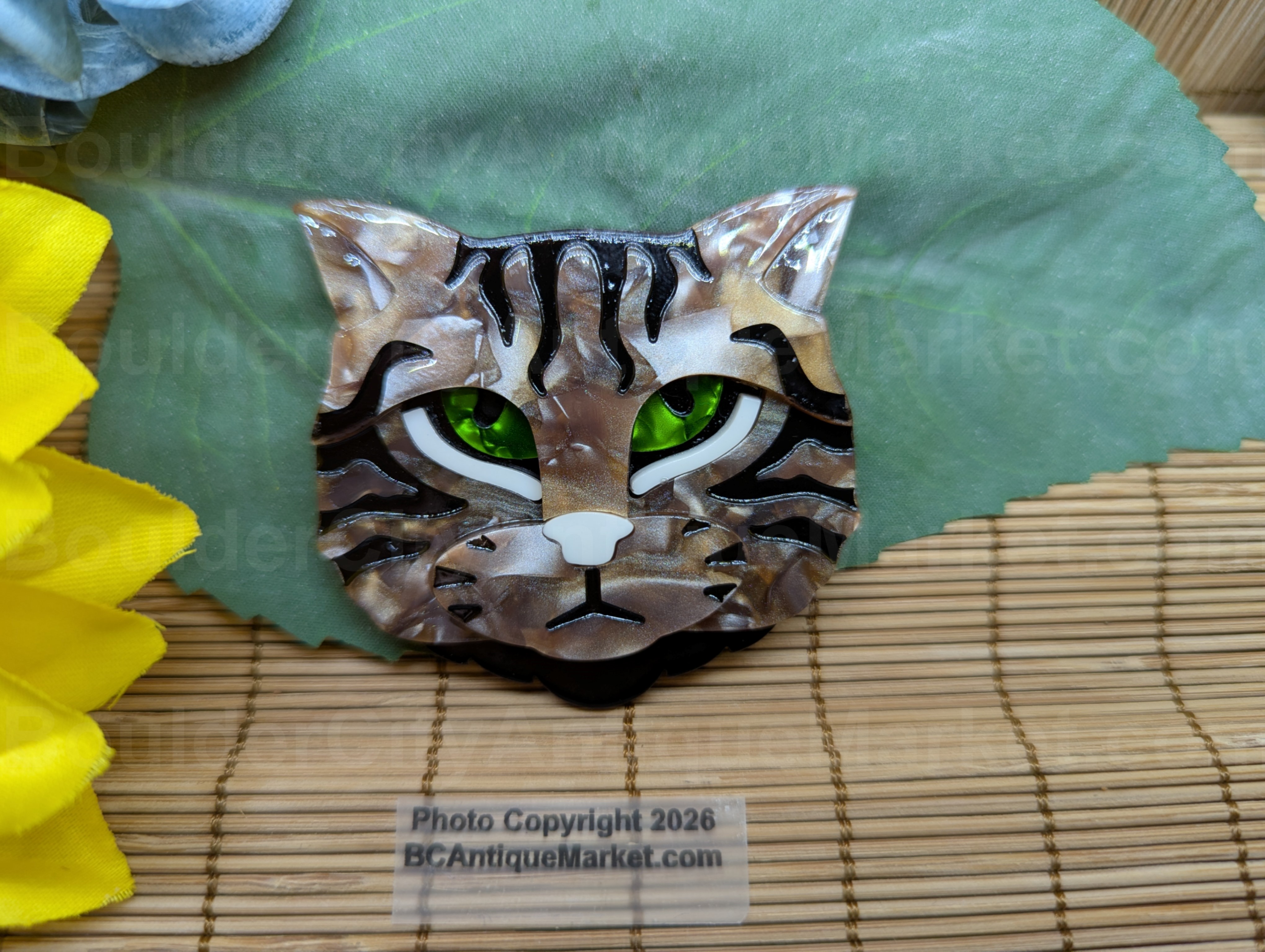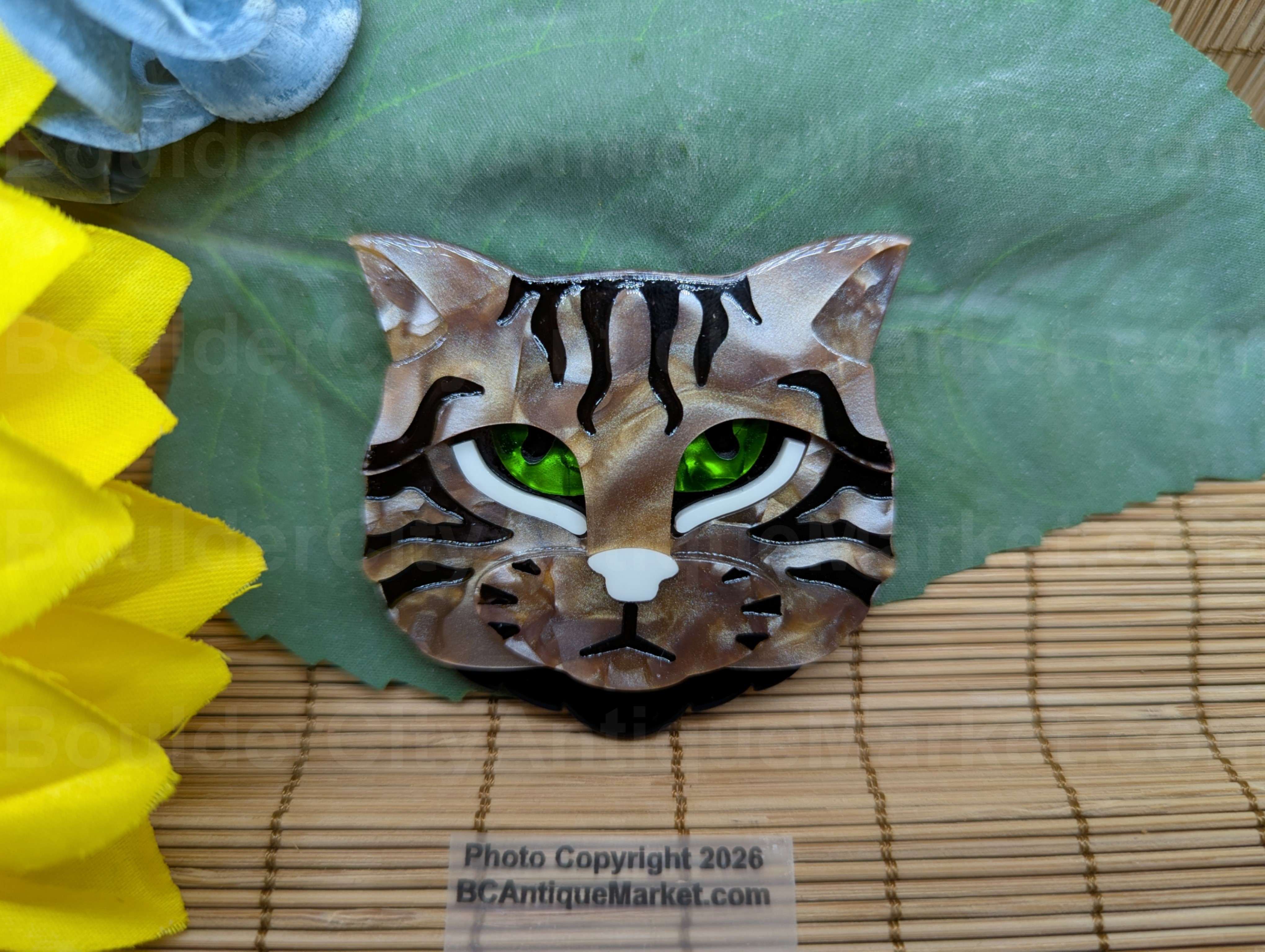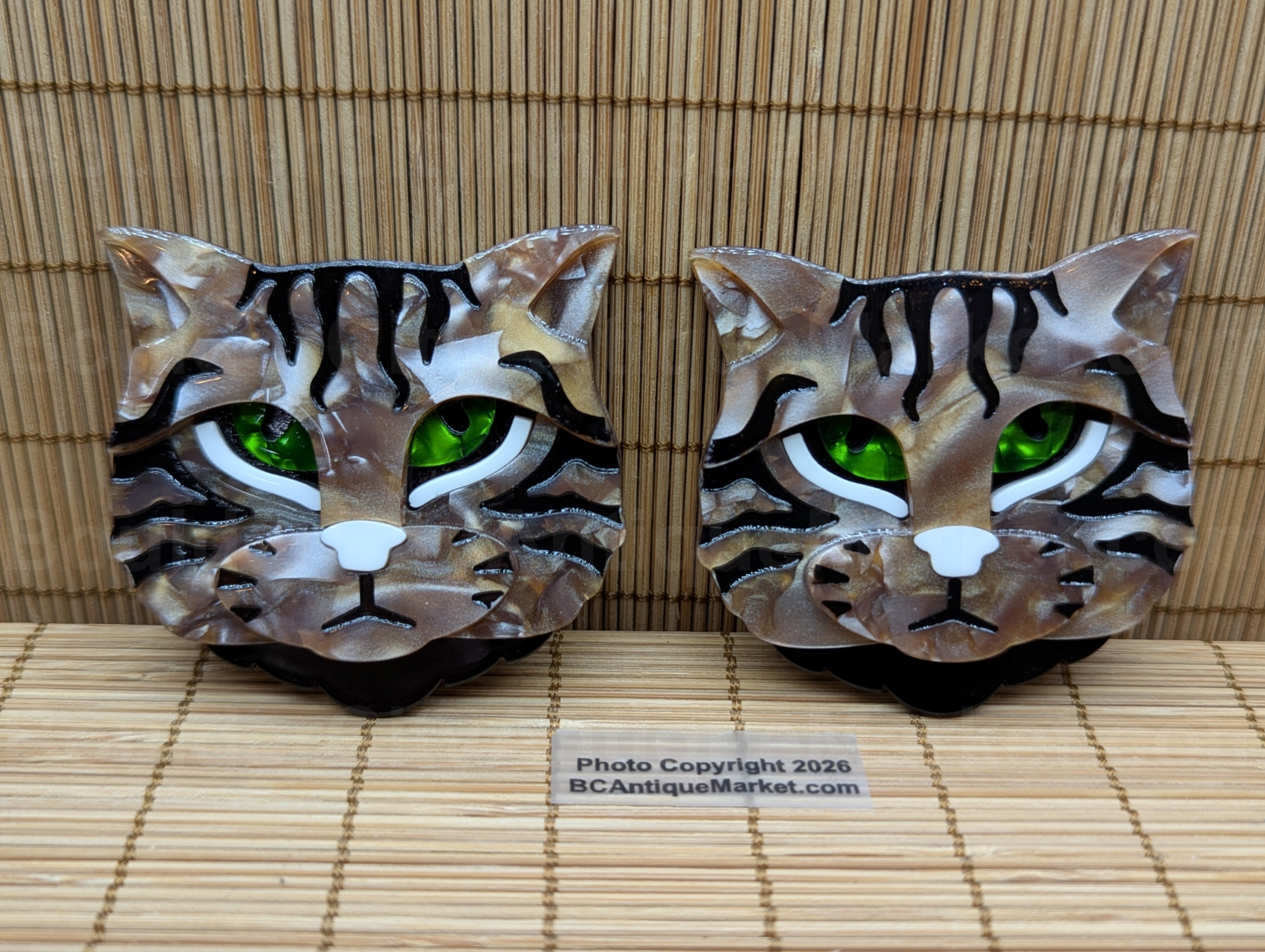 Beautiful swirled brown acrylic, black tabby stripes, white details and deep green swirled acrylic eyes. This brooch measures 2.25-inches tall and 2.25-inches wide. Each cat varies slightly in the brown swirl pattern.