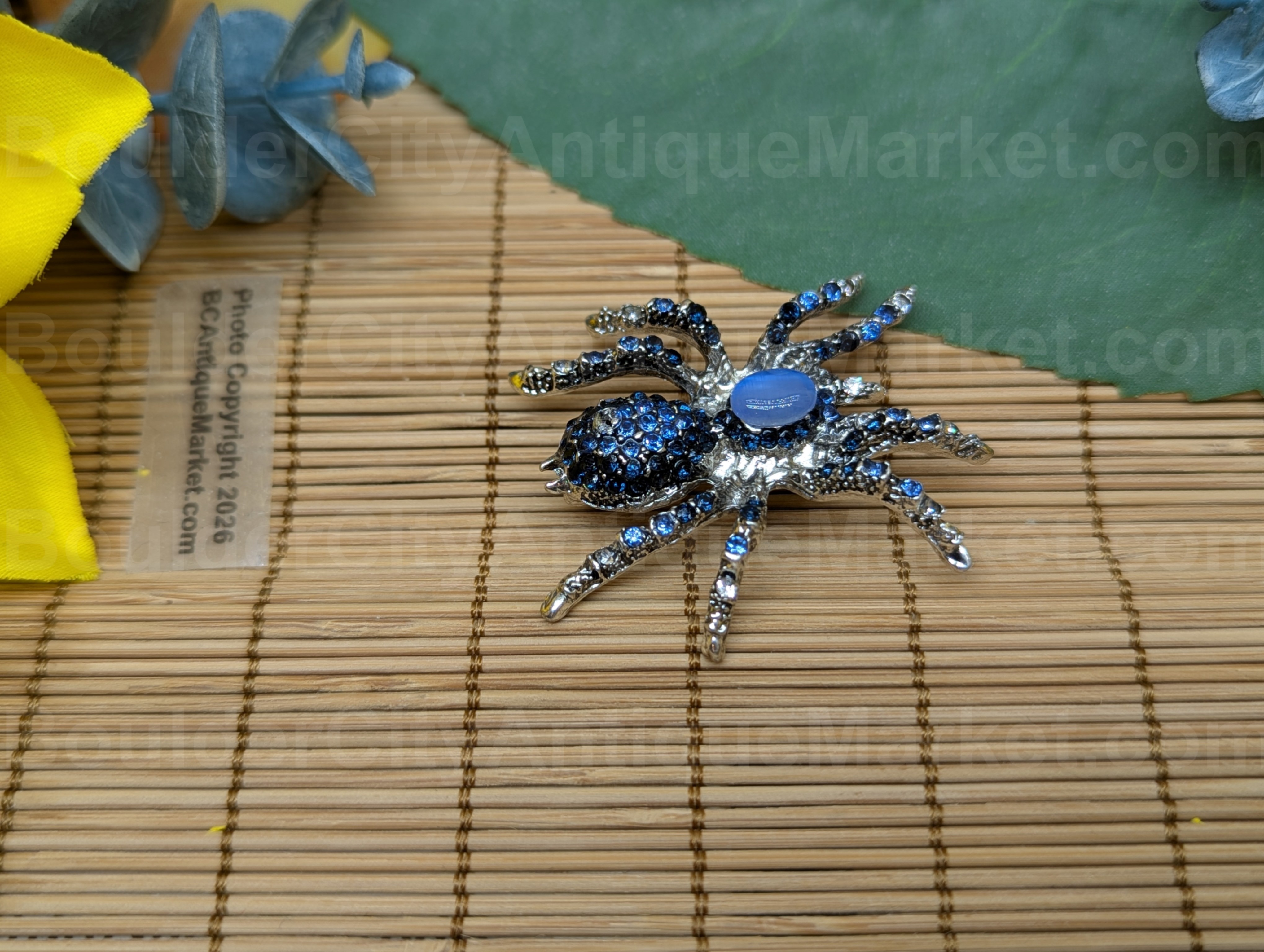 An artificial grey cat’s eye gem forms the carapace of this black rhinestone spider. The body and spinnerets are silver, the rhinestones on the abdomen, legs and pedipalps are black. She is a little over 1.75-inches in length.
