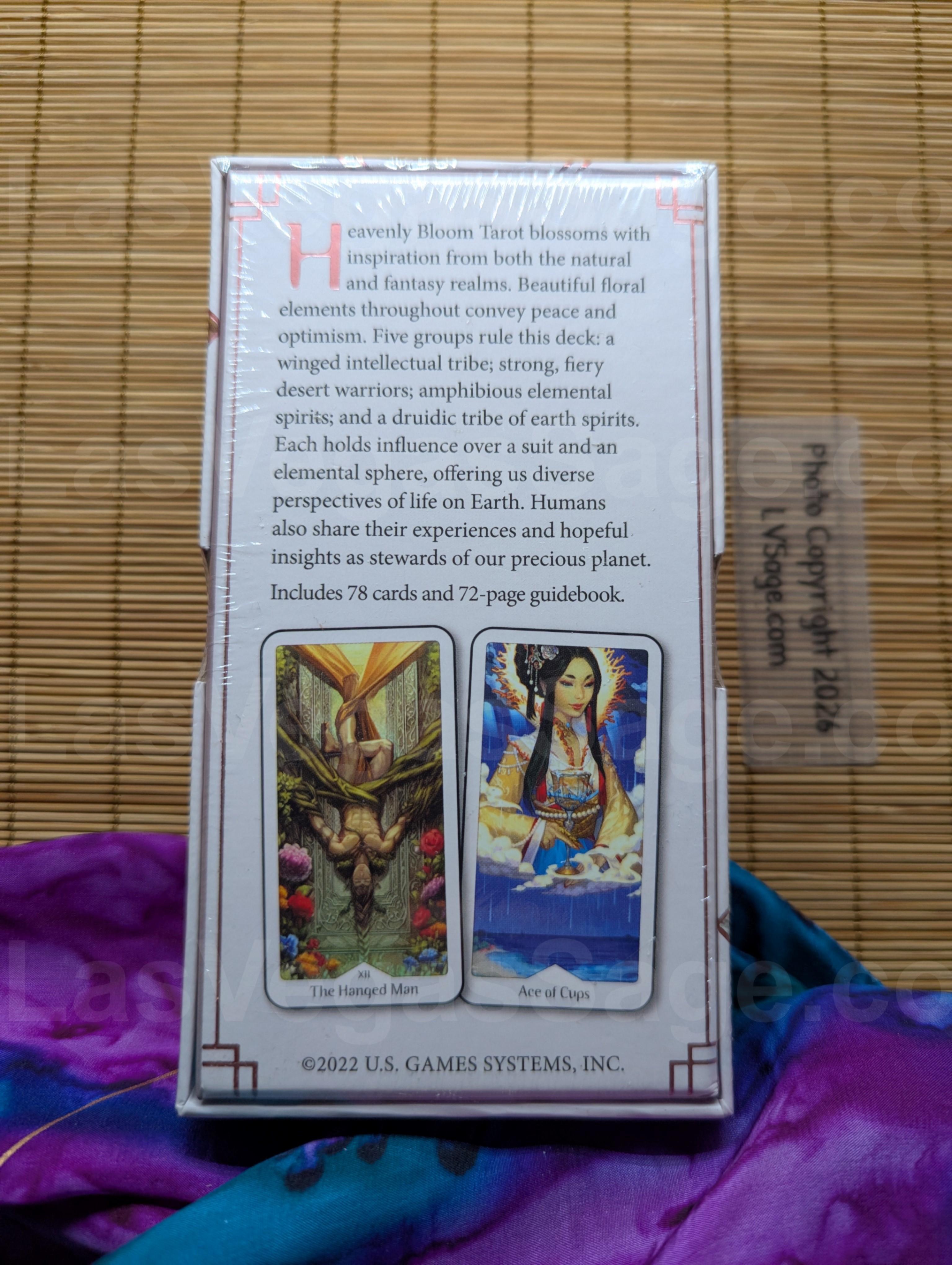 Heavenly Bloom Tarot blossoms with inspiration from both the natural and fantasy realms. Beautiful floral elements throughout convey peace and optimism. Five groups rule this deck: a winged intellectual tribe; strong, fiery desert warriors; amphibious elemental spirits; and a druidic tribe of earth spirits. Each holds influence over a suit and an elemental sphere, offering us diverse perspectives of life on Earth. Humans also share their experiences and hopeful insights as stewards of our precious planet.