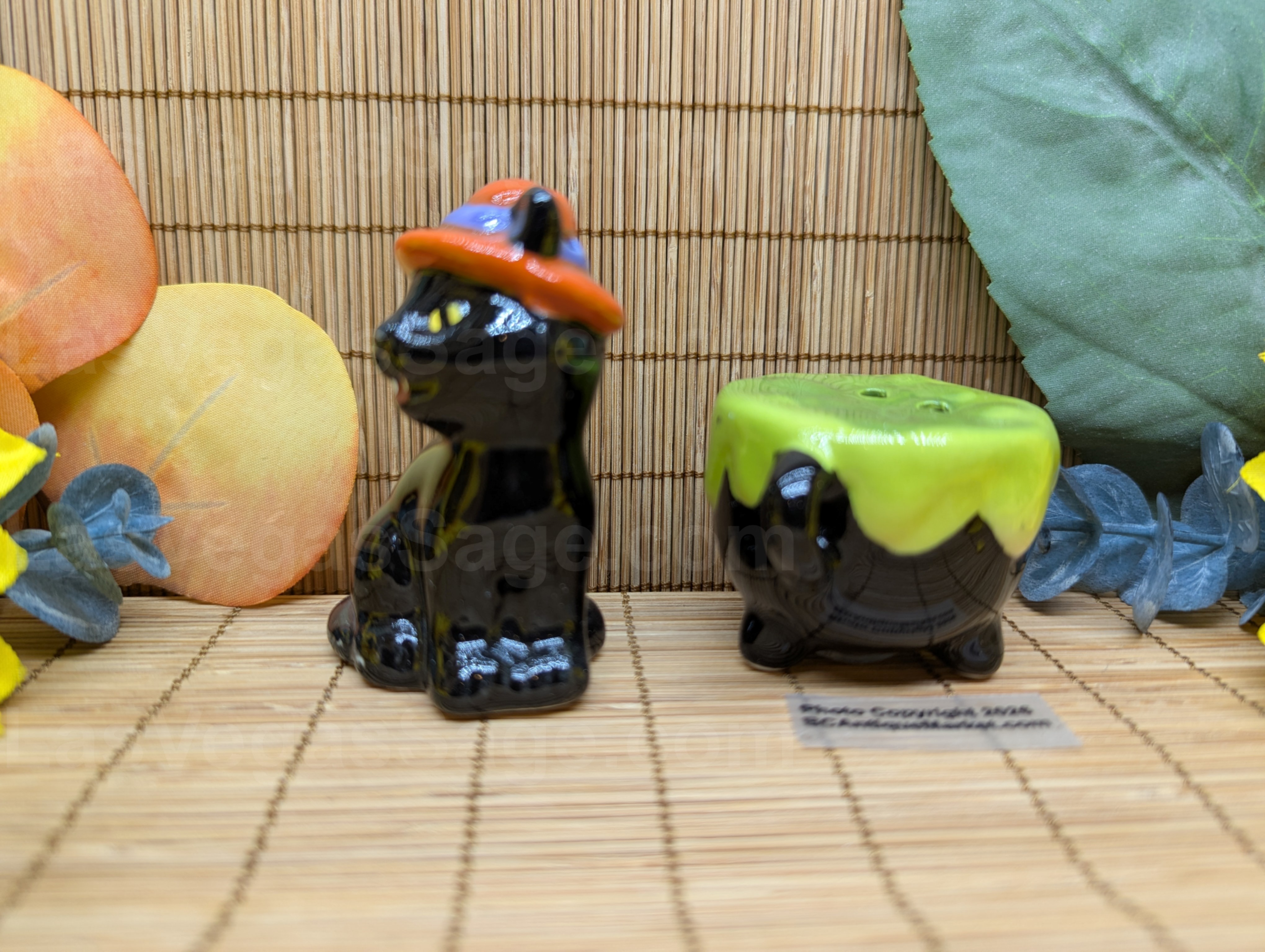Yellow eyed black cat in an orange witch’s hat watches over her green bubbling cauldron. Cat is aprox 2.75 inches tall.